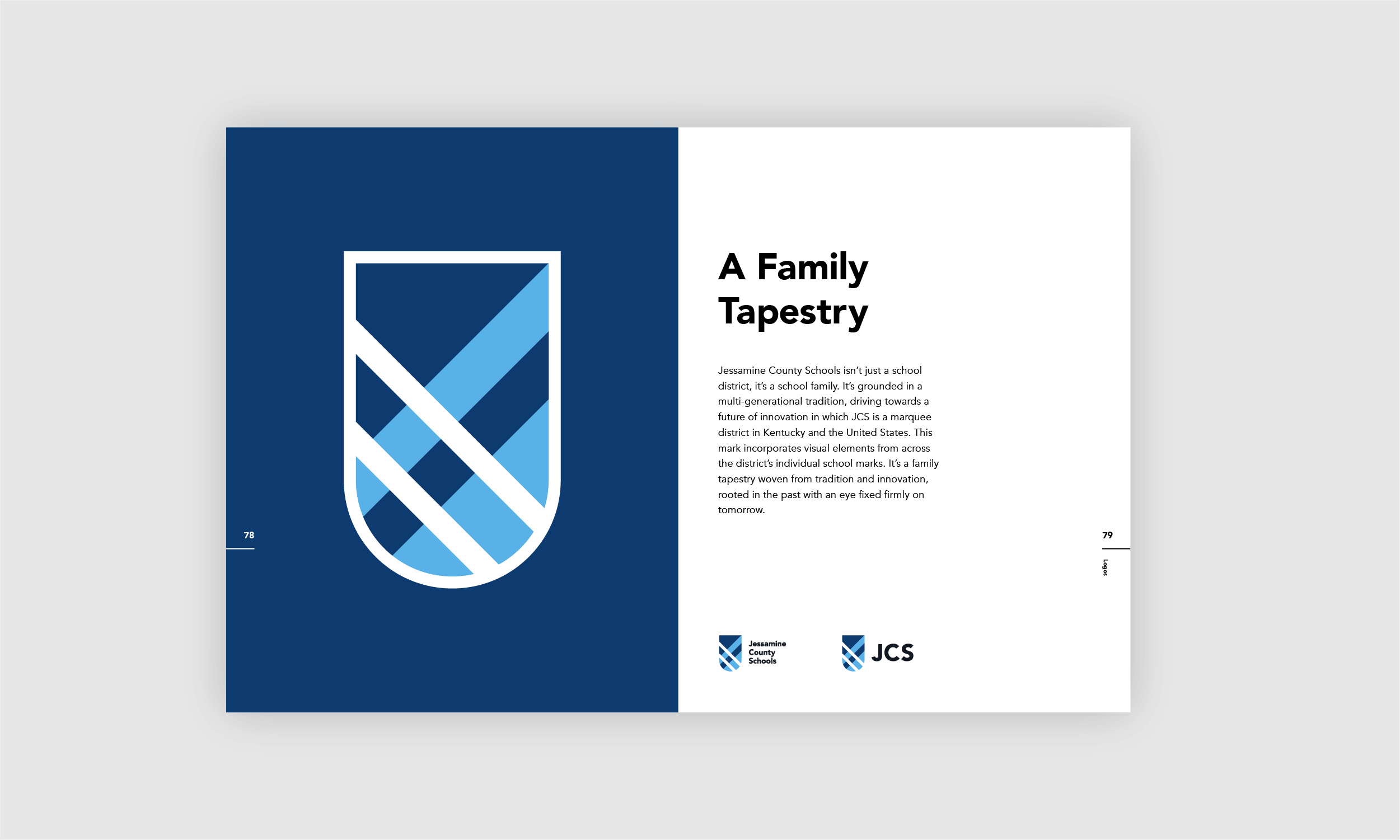 Jessamine County Schools is now considered a leader among its public education cohorts, showcasing a sophisticated visual identity that appeals to all of its constituents from 4 to 94. It features a modern family crest grid system built using each of the school's core narratives. Colors and typography are updated and consistent, while still retaining key brand elements from their previous logos.